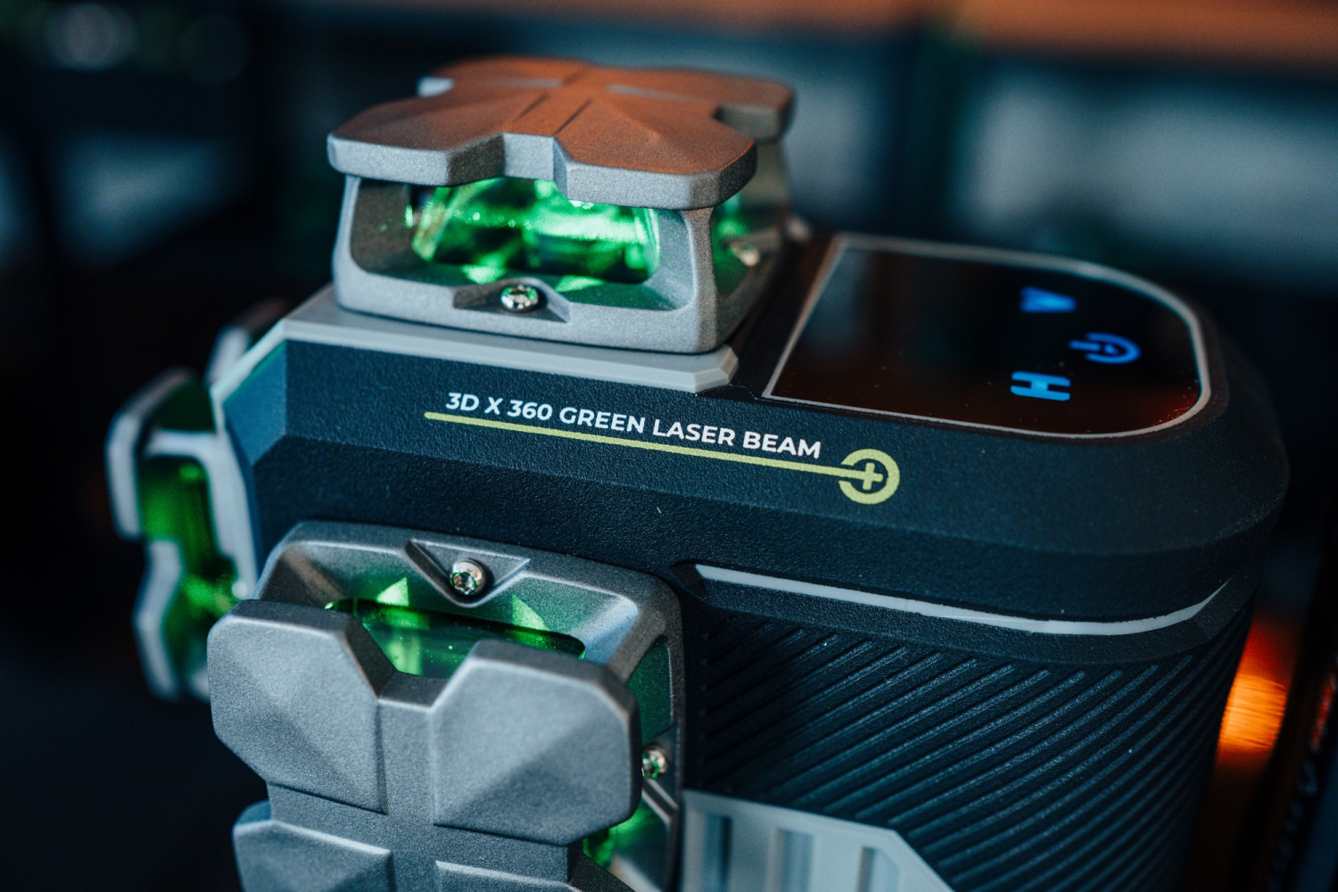 Wyświetlacz LCD: Pokazuje informacje o naładowaniu akumulatora, trybie pracy oraz kącie nachylenia urządzenia, ułatwiając kontrolę nad pracą lasera.