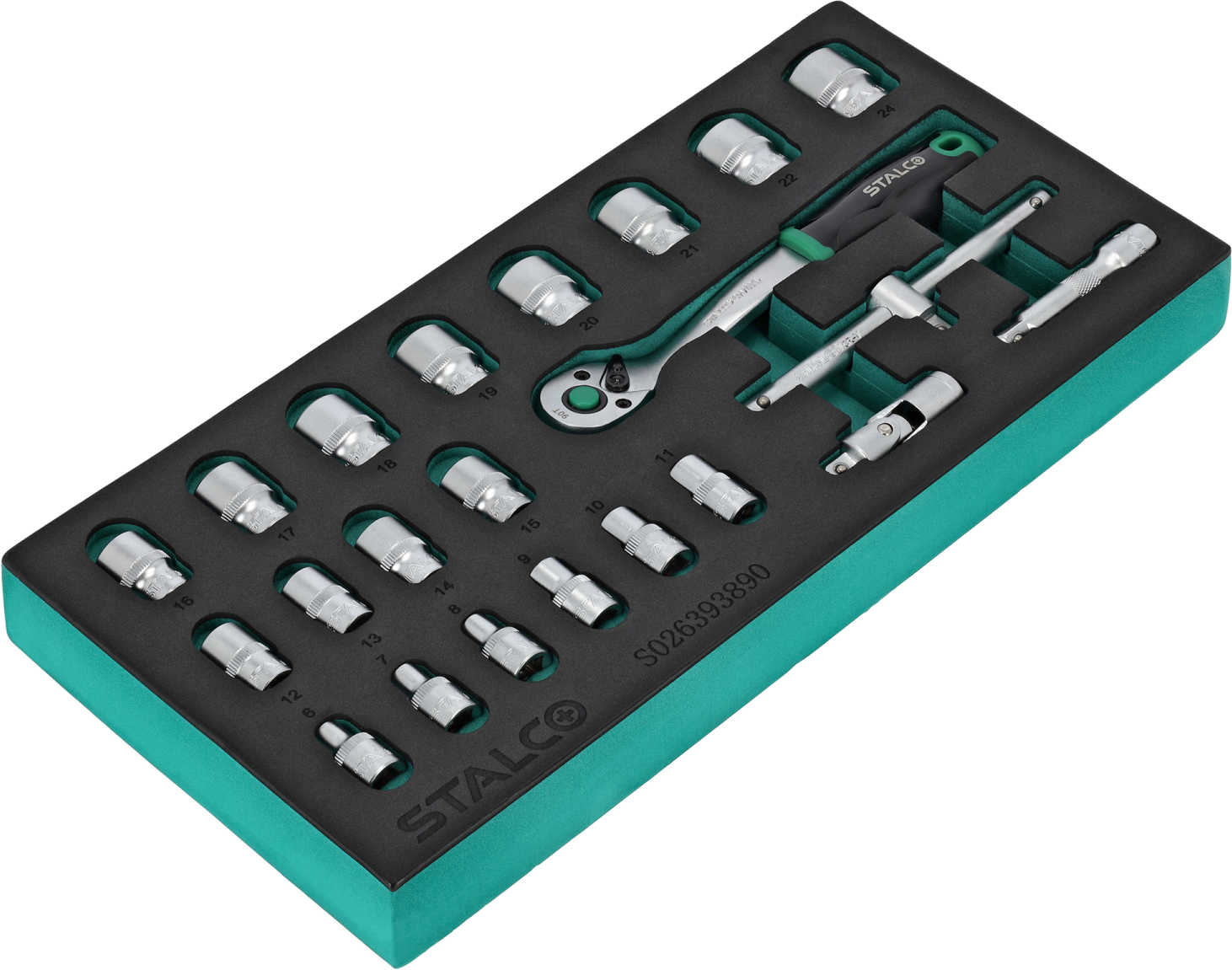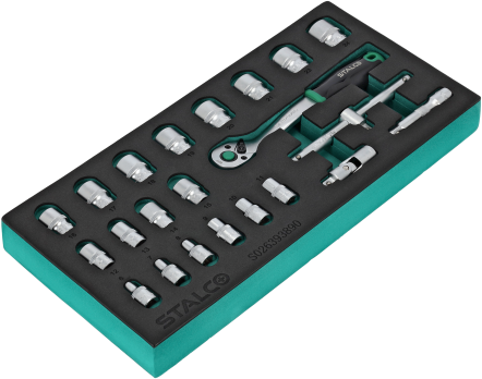 - Wkładka z pianki EVA z kluczami nasadowymi w rozmiarze 3/8". przeznaczona do wszystkich szafek narzędziowych STALCO. Rozmiar 1/3 szuflady