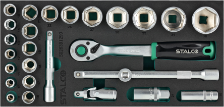 - Wkładka z pianki EVA z kluczami nasadowymi w rozmiarze 1/2". przeznaczona do wszystkich szafek narzędziowych STALCO. Rozmiar 1/3 szuflady