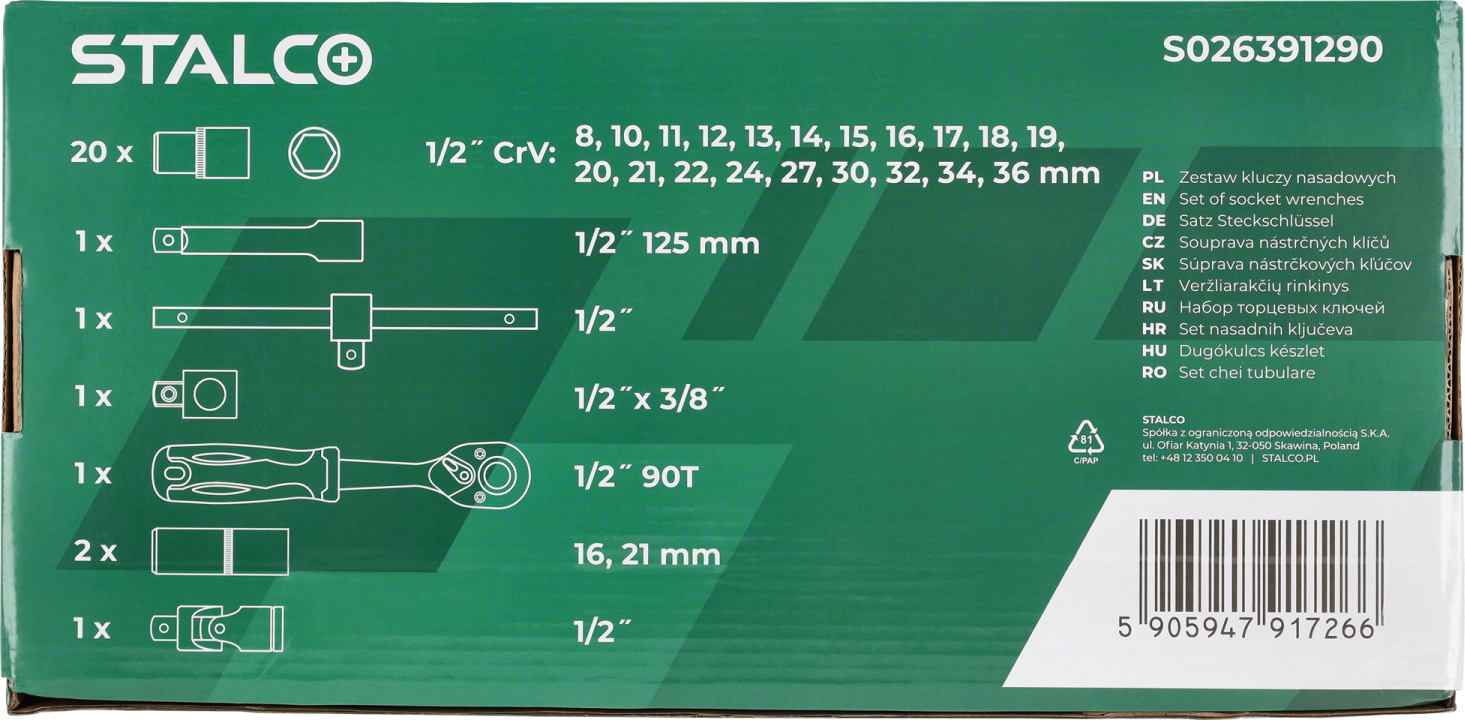 Socket Set 1/2” 8-36mm 27pcs CrV 90T STALCO STALCO S026391290