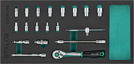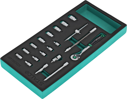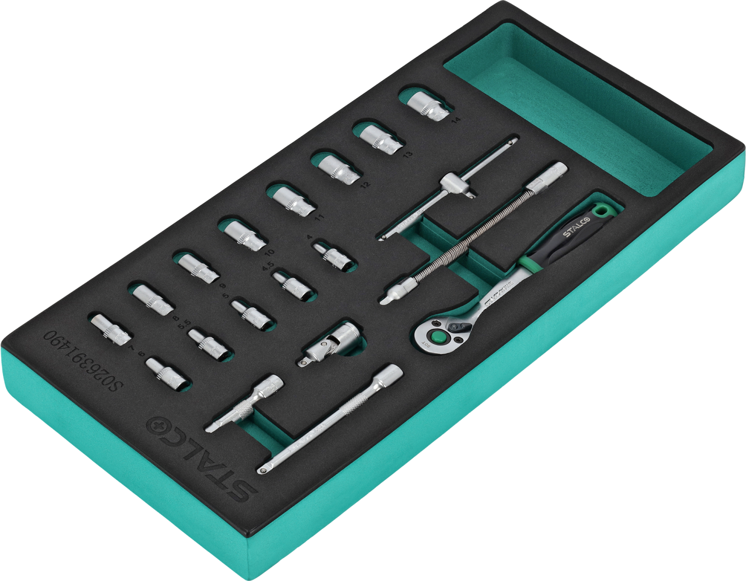 - Wkładka z pianki EVA z kluczami nasadowymi w rozmiarze 1/4". przeznaczona do wszystkich szafek narzędziowych STALCO. Rozmiar 1/3 szuflady