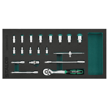 Wkładka z pianki EVA z kluczami nasadowymi w rozmiarze 1/4", przeznaczona do wszystkich szafek narzędziowych STALCO . Rozmiar 1/3 szuflady.