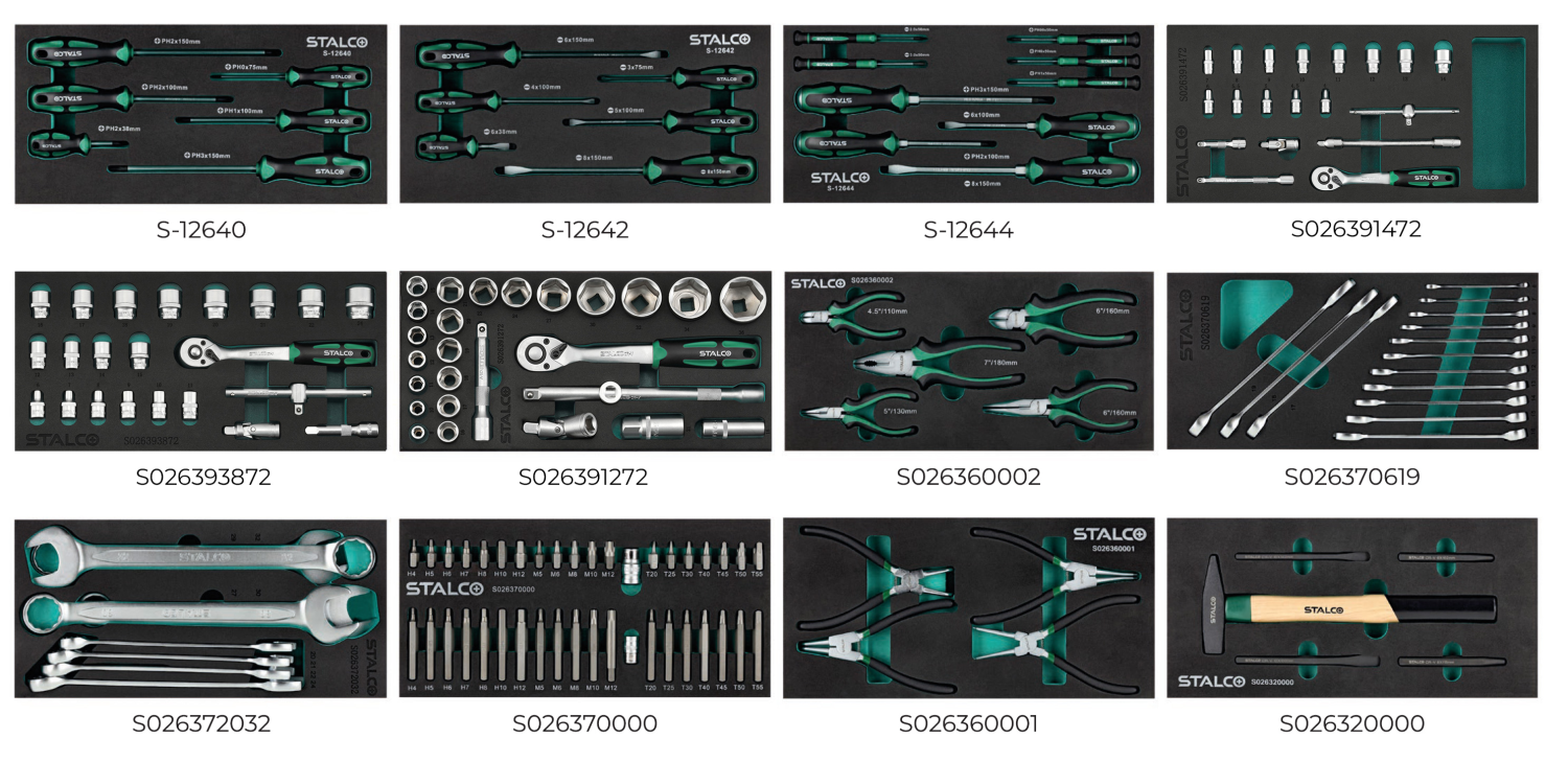 SKŁAD ZESTAWU: S-42252 - Szafka narzędziowa S-12640 - Zestaw wkrętaków PHILLIPS S-12642 - Zestaw wkrętaków PŁASKICH S-12644 - Zestaw wkrętaków precyzyjnych & do pobijania S026390014 - Zestaw kluczy nasadowych 1/4", 4-14 mm S026390038 - Zestaw kluczy nasadowych 3/8", 6-24 mm S026390012 - Zestaw kluczy nasadowych 1/2", 8-36 mm S026360002 - Zestaw szczypiec S026370679 - Zestaw kluczy płasko oczkowych 6-79 mm S026372032 - Zestaw kluczy płasko oczkowych 20-32 mm S026370000 - Zestaw bitów Hex, Torx, Spline z adaptorami S026360001 - Zestaw narzędzi S026320000 - Zestaw narzędzi Zestaw 165 elementów