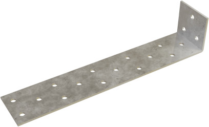 Kątownik kotwowy wykonany został z ocynkowanej blachy stalowej. Ramiona o niesymetrycznej długości ułożone są pod kątem prostym, na których znajdują się otwory montażowe na akcesoria złączne.