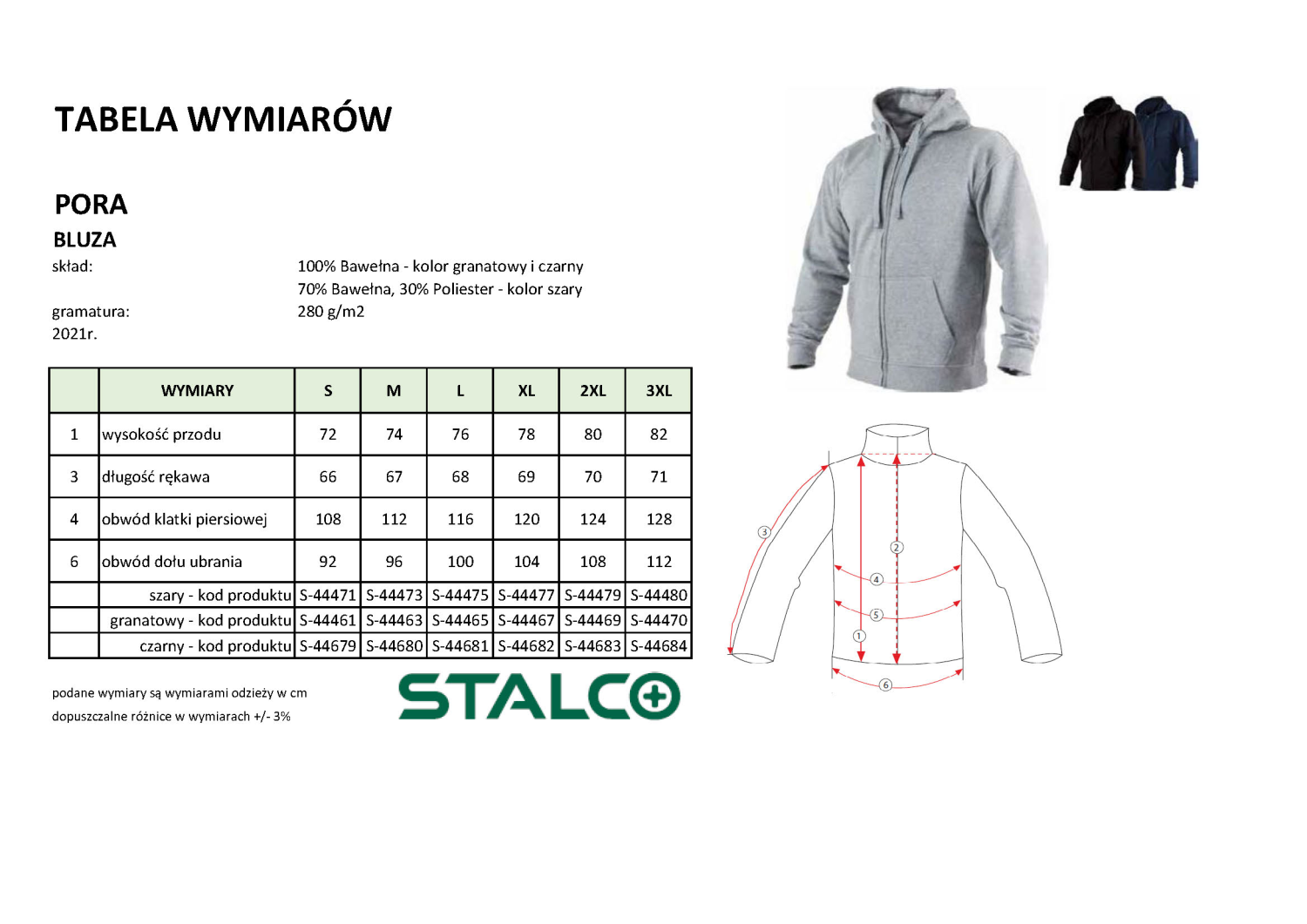 Uniwersalna bluza z kapturem PORA jest częścią odzieży, która przyda się przy przeprowadzaniu rozmaitych zadań. Będzie świetnym elementem ubioru pracowników wykonujących lekkie fizyczne zadania jak montaż, serwis, prace magazynowe i transport. Sprawdzi się w codziennym użytkowaniu, a także jako tymczasowe zabezpieczenie przed chłodem. Wysoki komfort użytkowania zapewnia odpowiednio dobrana dzianina bawełniana. Bluza ma luźny uniwersalny krój, dlatego nie stanowi ograniczenia przy wykonywaniu skrajnych ruchów. Jest oferowana w trzech wariantach kolorystycznych.