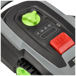 Robot koszący został również wyposażony w ręczny system zatrzymania maszyny, dzięki czemu w razie potrzeby naciskając czerwony przycisk na górze robota koszącego można natychmiast przerwać jego pracę. Dodatkowo maszyna posiada zabezpieczenie kodem PIN co chroni ją przed nieautoryzowanym uruchomieniem lub zmianą ustawień. Robot wyposażony jest również w czujniki przechylenia lub przewrócenia, dzięki czemu maszyna wyłącza się automatycznie gwarantując wysoki poziom bezpieczeństwa w trakcie pracy.