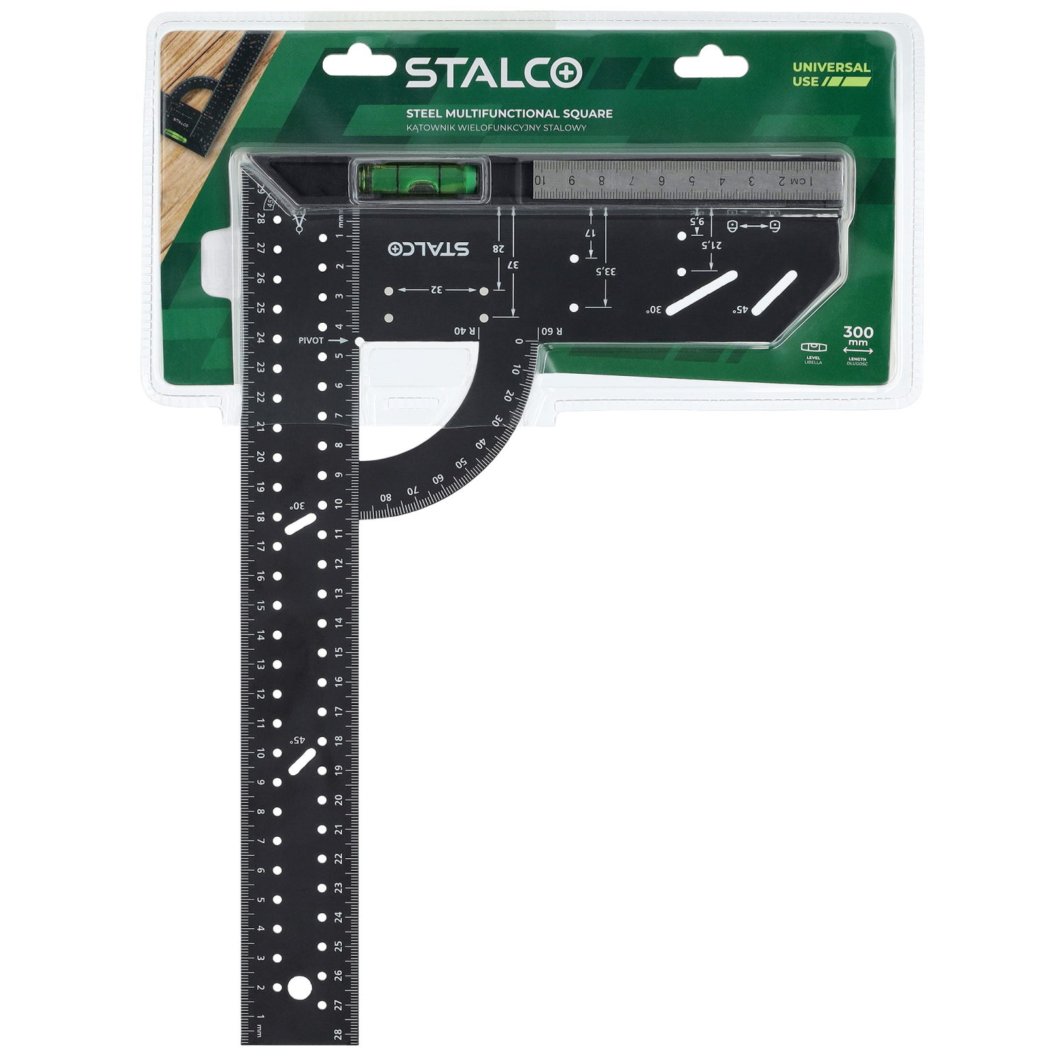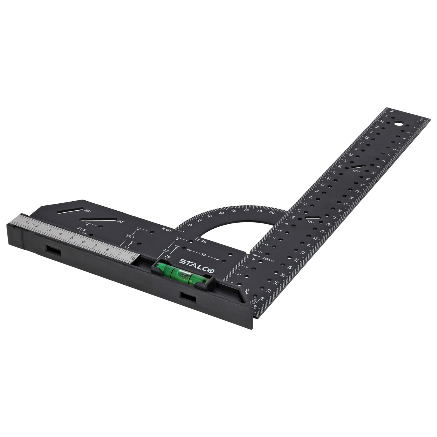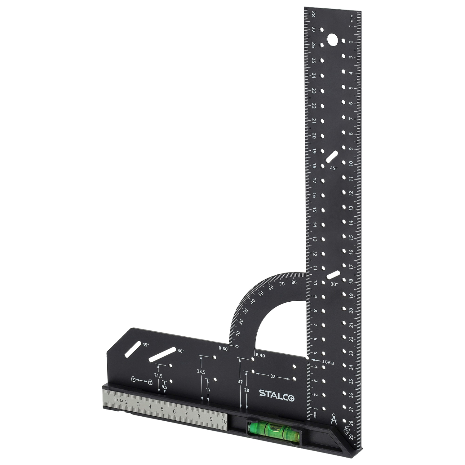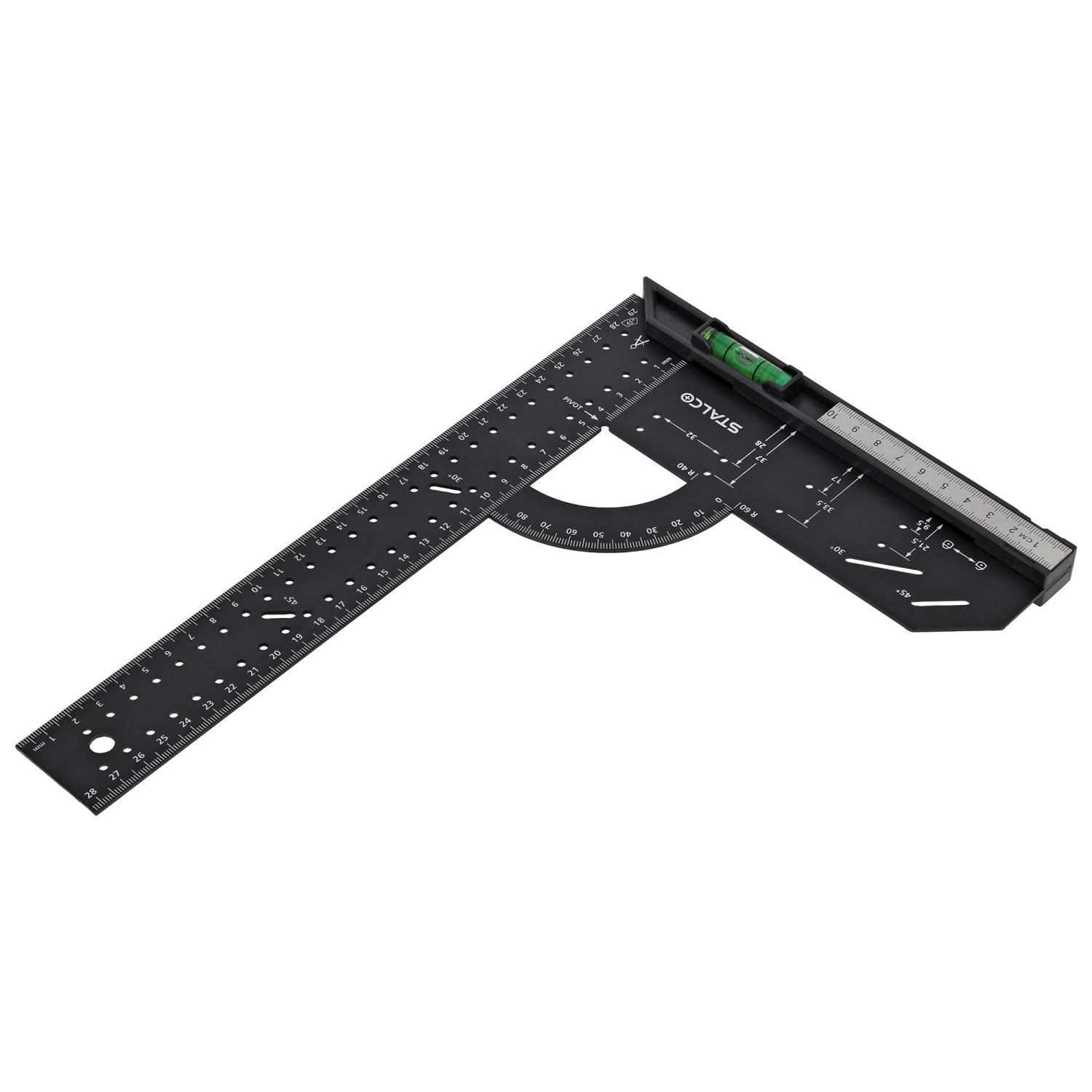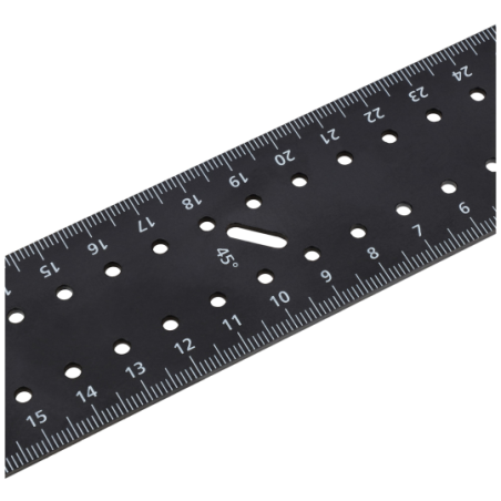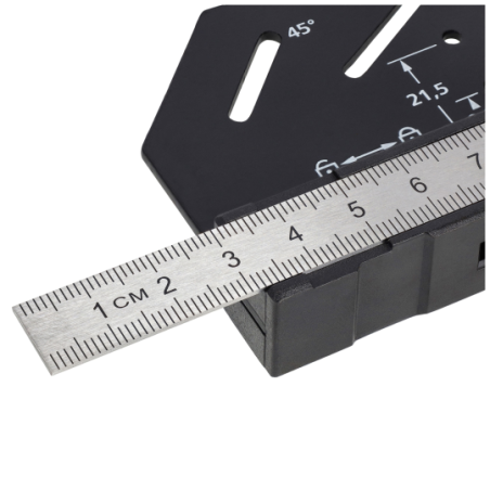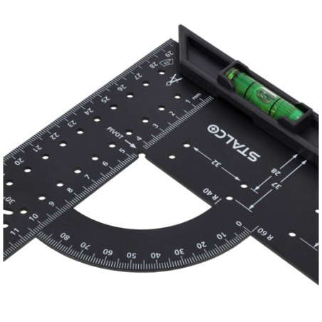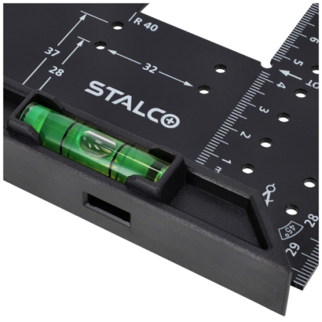 - Wyposażony w poziomicę oraz dodatkową małą linijkę, umożliwia precyzyjne pomiary poziome, kontrolę głębokości, wyznaczanie kątów oraz dokładne znakowanie.
