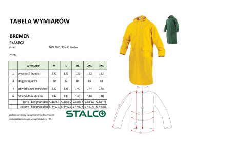 Płaszcz wodoodporny BREMEN to element funkcjonalnej odzieży typowej na słotne dni. Zastosowanie materiałów chroniących przed wilgocią, umożliwia pracę czasie opadów deszczu i śniegu. Sprawdza się głównie w pracach prowadzonych w branży rolniczej, ogrodniczej, a także lekkich pracach polowych. Zielony płaszcz wodoodporny BREMEN marki STALCO jest wykonany z materiału zawierającego 70% PVC i 30% poliestru. Wszystkie szwy są klejone, co gwarantuje szczelność i trwałość łączenia. Dodatkową ochronę przed deszczem stanowi kaptur ściągany troczkiem. Płaszcz sięga poniżej kolan, dlatego osłania większą powierzchnię ciała. Dla zapewnienia komfortu podczas prowadzenia pracy, w płaszczu zastosowano system wentylacji, w postaci przestrzeni z ukrytymi otworami na barkach. Płaszcz oferowany jest we wszystkich rozmiarach w zakresie od M do 3XL.