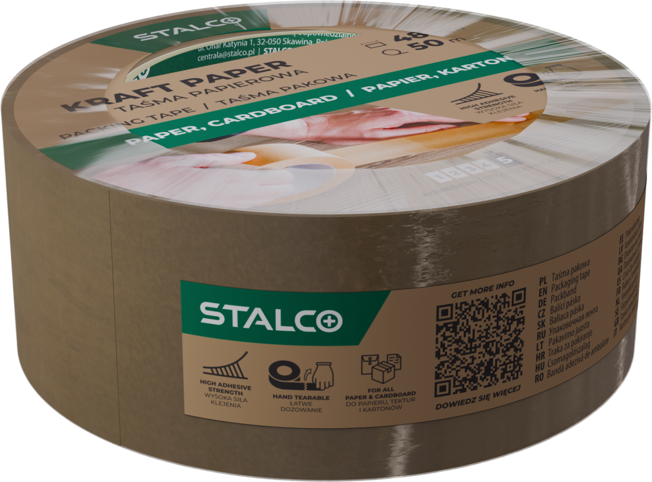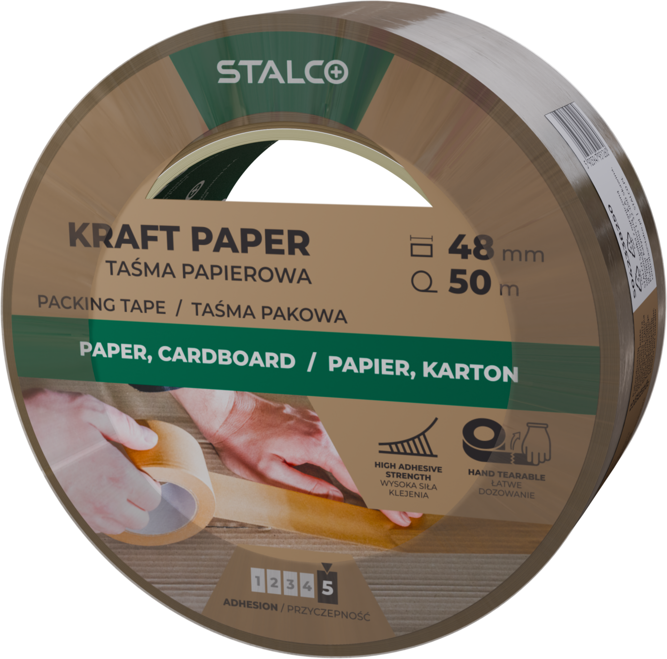 Taśma pakowa papierowa — ekologiczna alternatywa dla tradycyjnych taśm plastikowych, znajdująca szerokie zastosowanie w pakowaniu przesyłek i kartonów. Wykonana z wytrzymałego papieru kraft o wysokiej gramaturze, który produkowany jest z niebielonej celulozy, charakteryzuje się dużą odpornością na rozciąganie i rozerwanie. Papier kraft ceniony jest za naturalną trwałość i przyjazny środowisku charakter, dzięki czemu taśma doskonale wpisuje się w ekologiczne rozwiązania stosowane w logistyce i branży budowlanej. Produkt sprawdza się zarówno w domu, biurze, magazynie, jak i w warsztatach DIY. Taśma może być łatwo odrywana ręcznie, bez konieczności używania nożyczek czy ostrzy, a jednocześnie zapewnia wysoką przyczepność do większości powierzchni: drewna, tektury, folii, plastiku, metalu i posadzek.