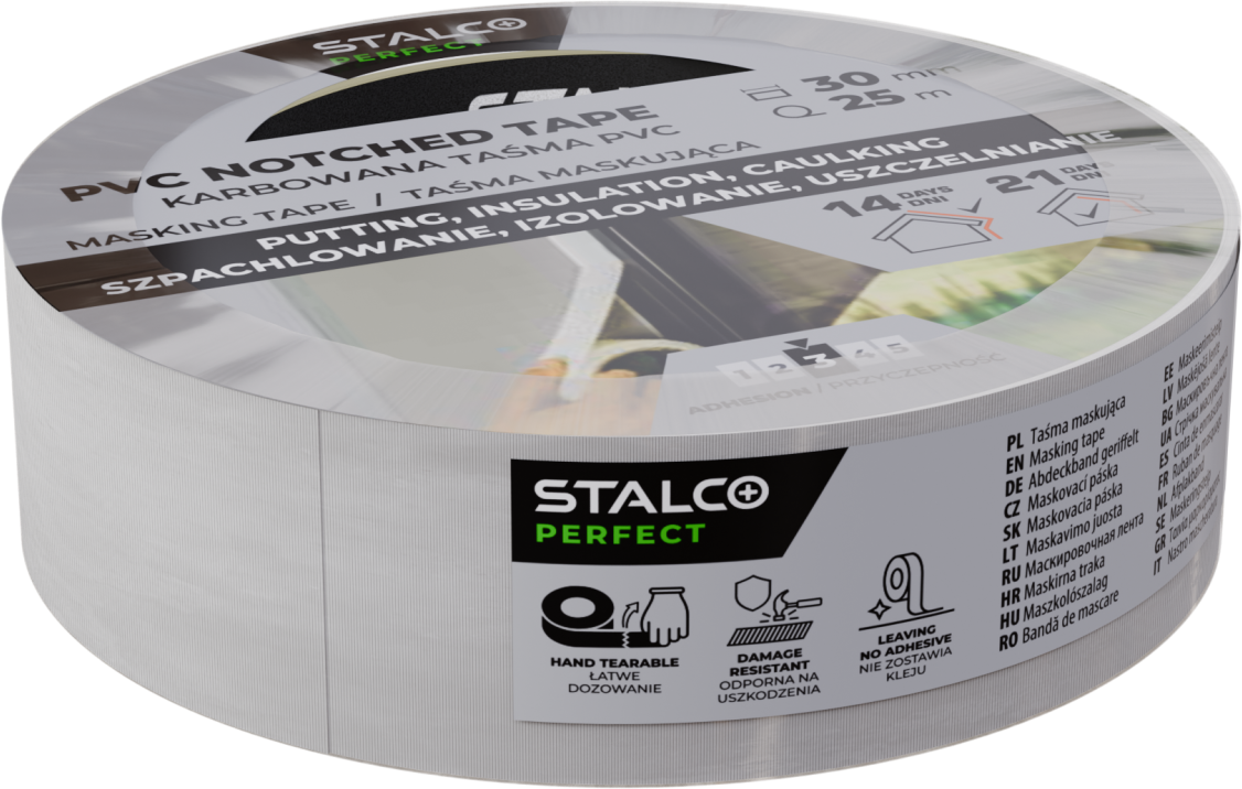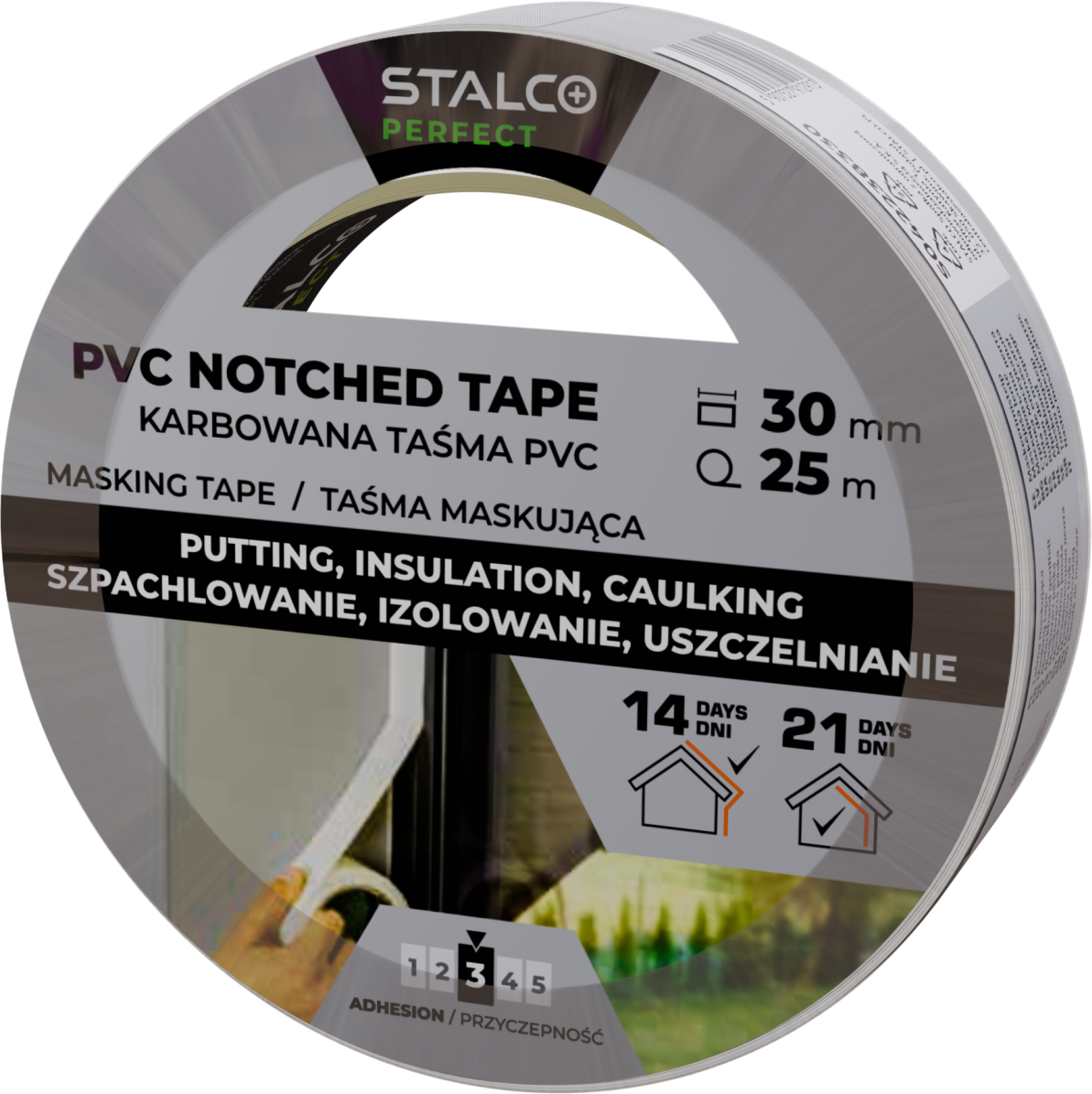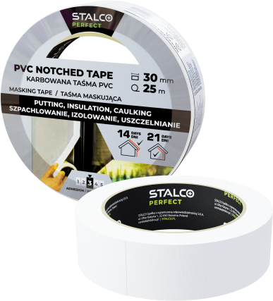 Taśma maskująca PVC karbowana – specjalistyczna taśma wykonana z miękkiej i elastycznej folii z polichlorku winylu (PVC), pokrytej klejem na bazie kauczuku naturalnego. Charakteryzuje się wysoką przyczepnością do podłoży gładkich i lekko chropowatych, dzięki czemu łatwo i szybko przykleja się do powierzchni, a jednocześnie jest prosta w usuwaniu bez pozostawiania śladów kleju. Karbowana struktura sprawia, że taśma jest odporna na uszkodzenia mechaniczne, a także umożliwia jej łatwe ręczne zrywanie poprzeczne bez potrzeby użycia nożyczek czy ostrza. Produkt wyróżnia się odpornością na wilgoć i promieniowanie UV, co czyni go wszechstronnym rozwiązaniem do zastosowań wewnętrznych i zewnętrznych.