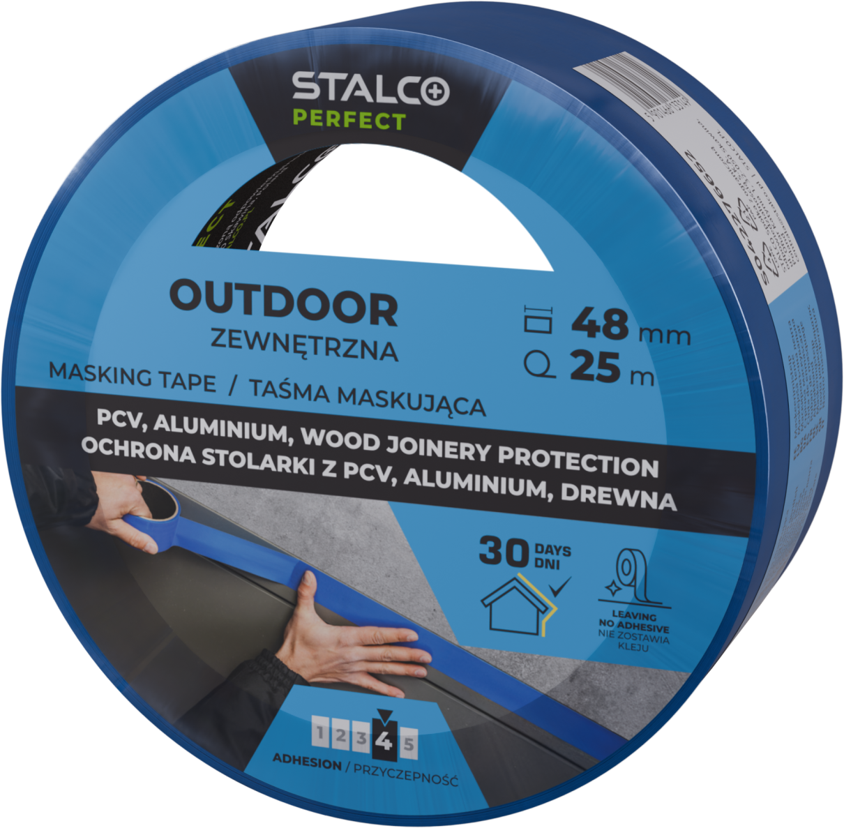 Taśma maskująca zewnętrzna - to wysokiej klasy specjalistyczna taśma ochronna wykonana z folii polietylenowej (PE) wzmocnionej siatką, co zapewnia jej wyjątkową trwałość i odporność na uszkodzenia mechaniczne. Dedykowana do wymagających zastosowań budowlanych i wykończeniowych, gdzie kluczowa jest odporność na intensywne czynniki atmosferyczne, promieniowanie UV oraz działanie wilgoci. Dzięki nowoczesnej formule kleju taśma doskonale przylega do zróżnicowanych podłoży, gwarantując stabilne mocowanie przez cały okres użytkowania, a jednocześnie umożliwia szybkie i czyste usunięcie bez pozostawiania resztek kleju. Ręczna zrywalność ułatwia aplikację w trudnodostępnych miejscach, a specjalnie opracowana powłoka klejąca pozwala na łatwe rozdzielenie taśmy w przypadku jej przypadkowego sklejenia. Produkt ten łączy w sobie wygodę użytkowania z wysoką niezawodnością, co czyni go niezastąpionym rozwiązaniem przy profesjonalnych pracach montażowych i zabezpieczających.