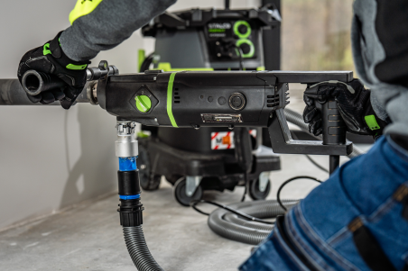 Przy specjalistycznych pracach budowlanych i remontowych polegających na wykonywaniu przewiertów o dużych średnicach, przydatna okaże się Wiertnica Diamentowa DDP202. To profesjonalne urządzenie budowlane, które dysponuje mocą 2200 W i osiąga maksymalną prędkość obrotową na poziomie 2600 obr/min. To pozwala na wydajną pracę otwornicami diamentowymi o średnicy nawet do 202 mm. Wiertnica Diamentowa DDP202 została wyposażona we wrzeciono z podwójnym gwintem, czyli 1- 1/4 oraz 1/2 cala. Dzięki temu możliwe jest pewne i bezpieczne mocowanie otwornic diamentowych lub innych akcesoriów o różnych typach uchwytów. Za bezpieczeństwo pracy odpowiada wyłącznik przeciwporażeniowy i system elektronicznej stabilizacji. Wiertnica Diamentowa DDP202 może być wykorzystywana do pracy na mokro i sucho, a dodatkowo zawiera przyłącze do odkurzacza.