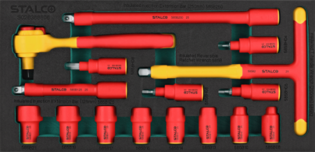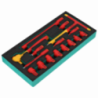 Profesjonalna wkładka do szafki narzędziowej z pianki EVA, zaprojektowana do optymalnego przechowywania zestawu kluczy nasadowych, nasadek oraz kluczy trzpieniowych. Narzędzia certyfikowane do napięcia 1000V , posiadają certyfikaty VDE GS oraz spełniają wymagania normy IEC 60900, Wkładka pasuje do wszystkich szafek narzędziowych STALCO i STALCO PERFECT
