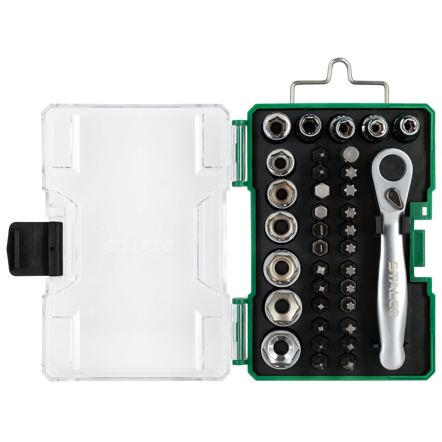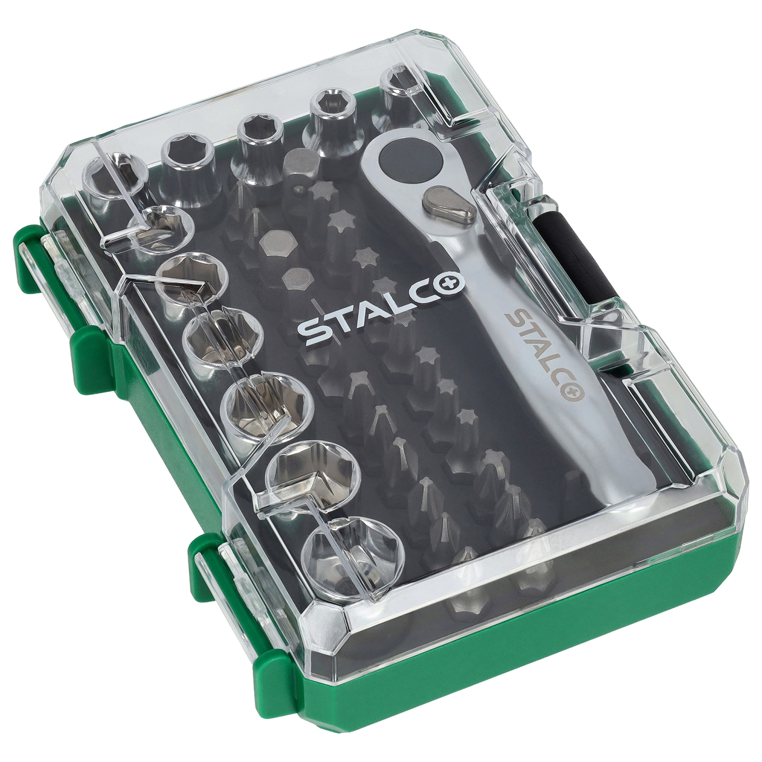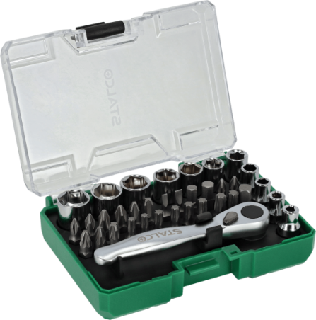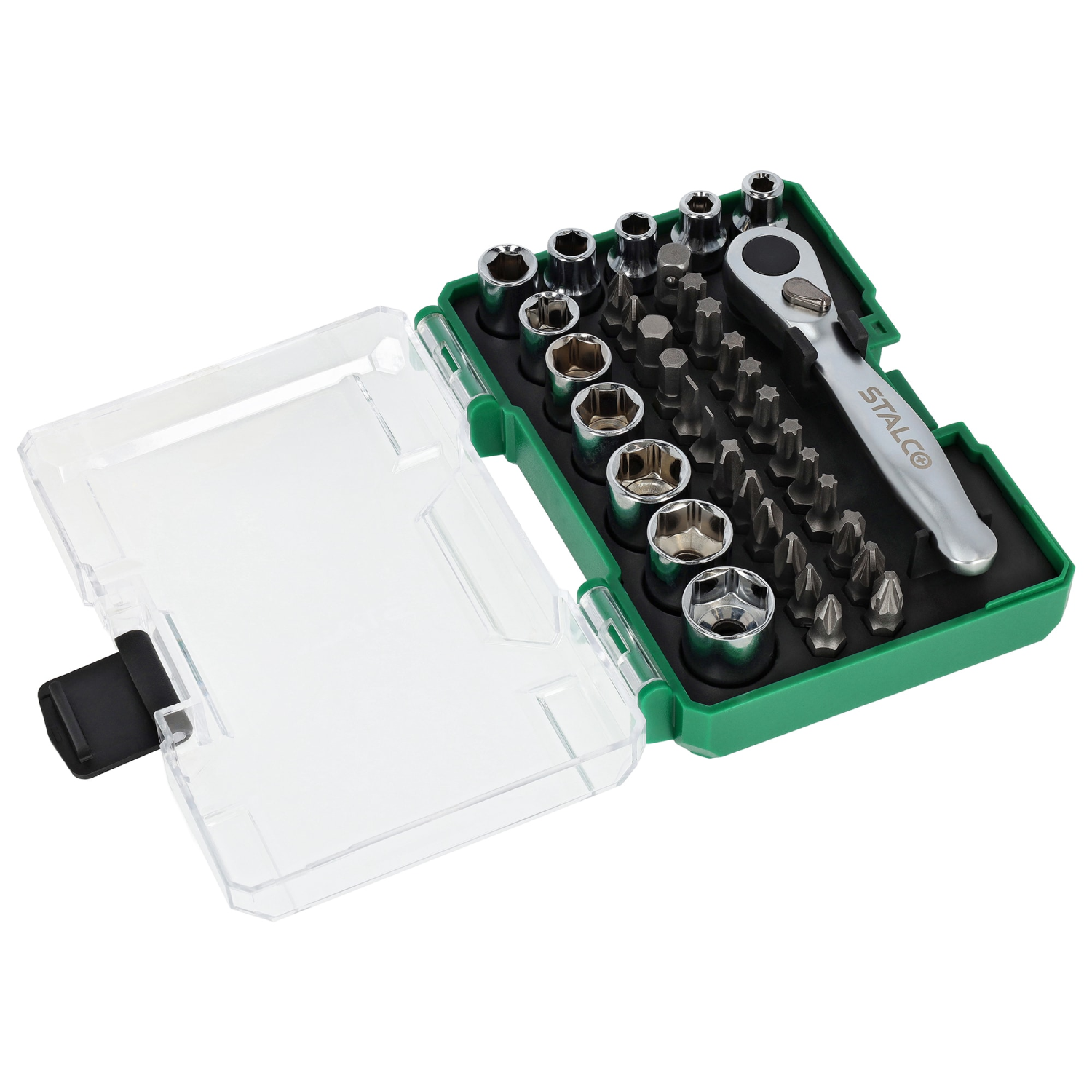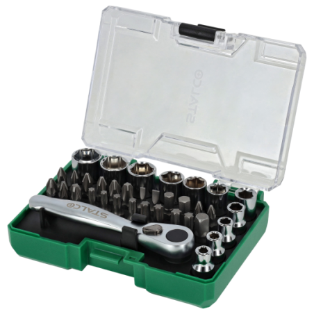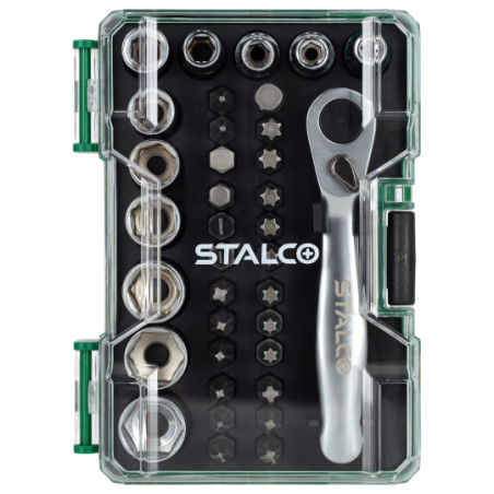 Zestaw bitów ze stali S2, nasadek CrV, grzechotka do bitów/nasadek 36elem. STALCO S060000036