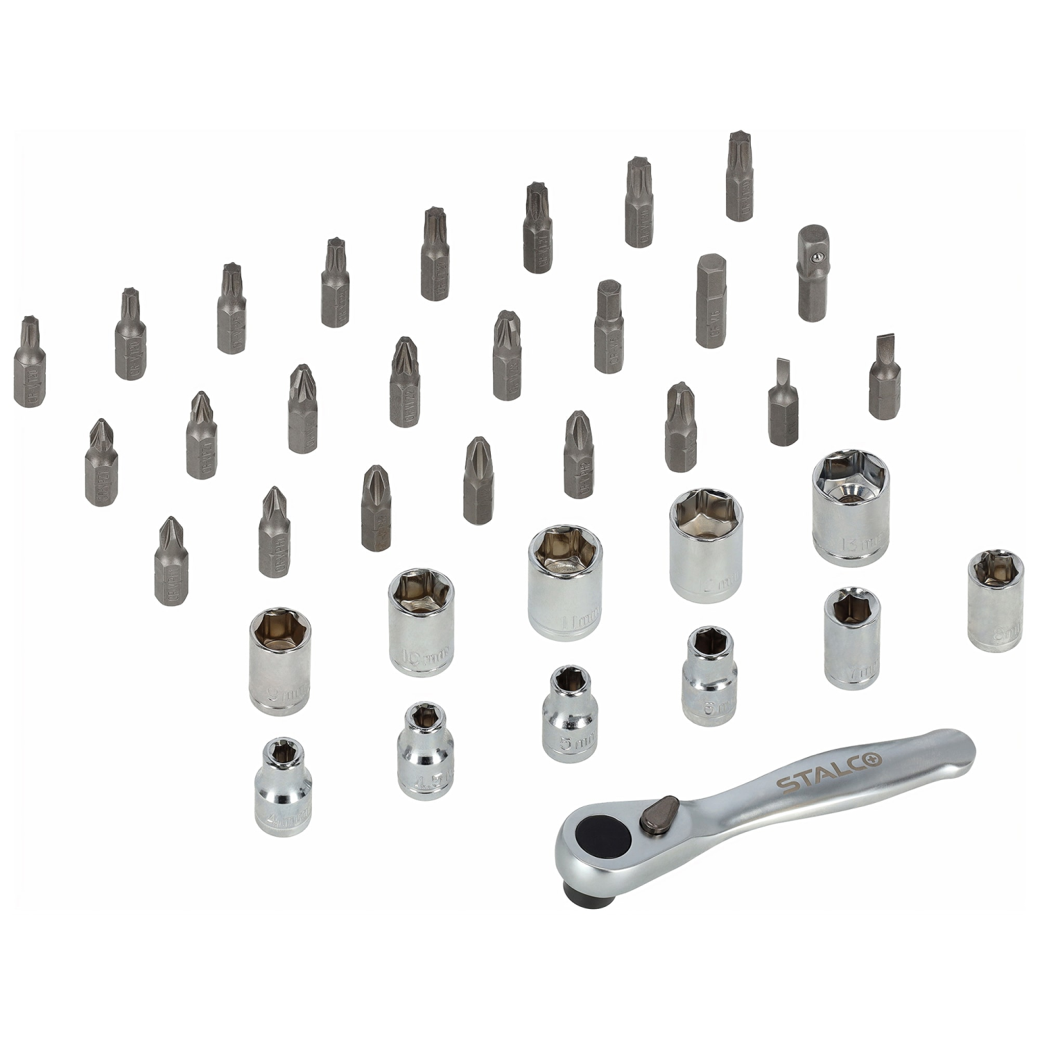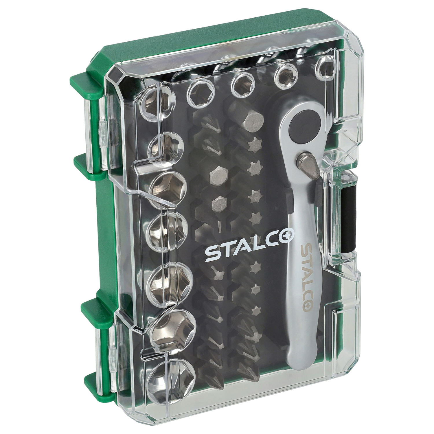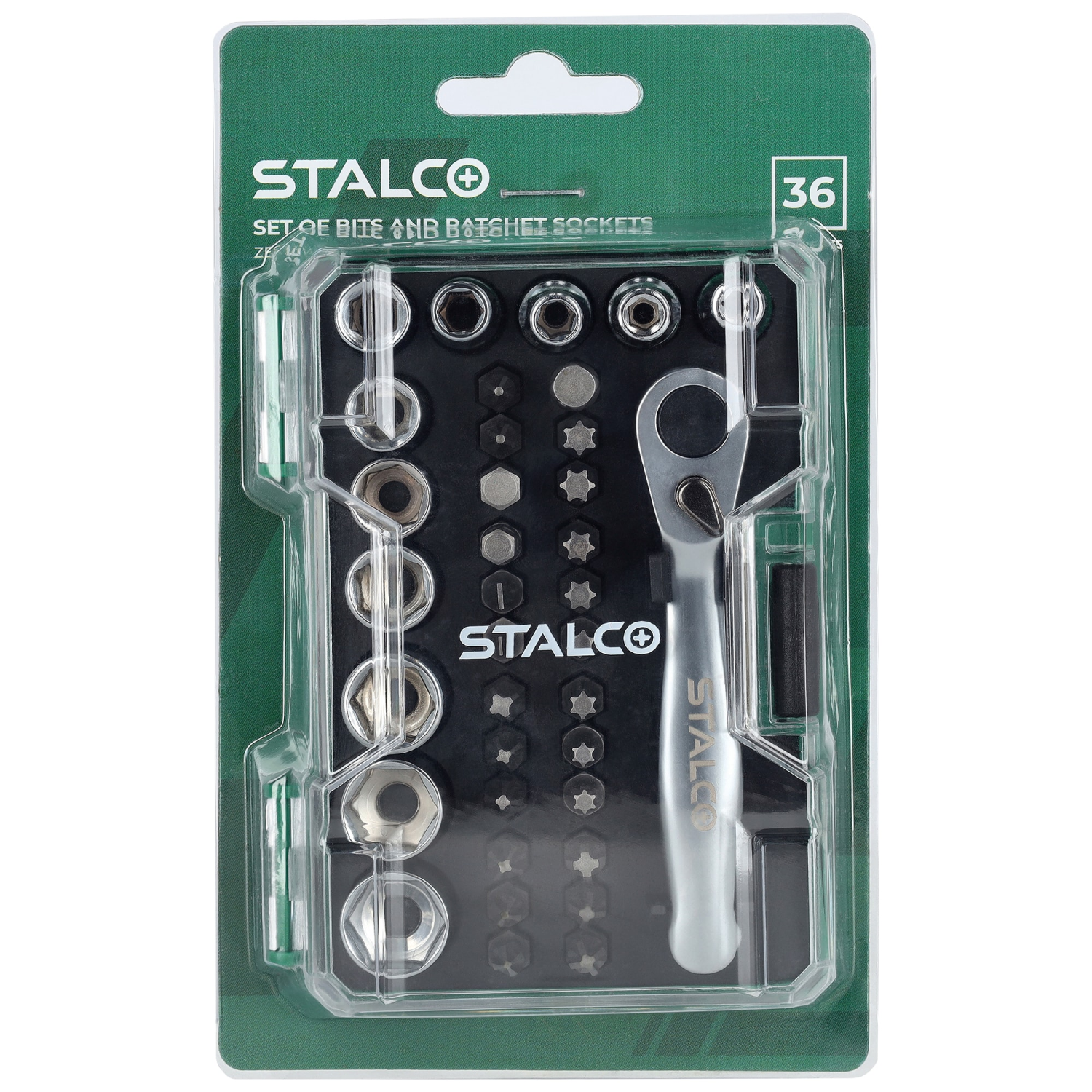 Zestaw bitów ze stali S2, nasadek CrV, grzechotka do bitów/nasadek 36elem. STALCO S060000036