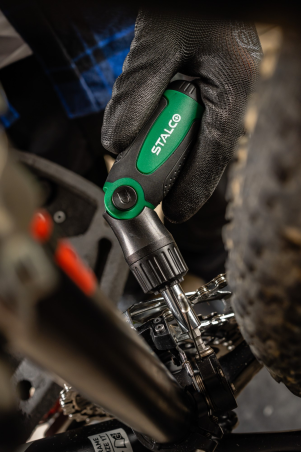 Szukając narzędzi o uniwersalnym zastosowaniu, warto zwrócić uwagę na wkrętak z grzechotką. Jest to sprzęt przydatny przy operowaniu przy śrubach i wkrętach. Można wykorzystać go w różnego rodzaju pracach manualnych. Sprawdza się przy pracach monterskich, serwisowych, a także drobnych naprawach w domu i wokół niego. Jest wyposażony w mechanizm zapadkowy, dlatego dokręcanie i odkręcanie śrub przebiega znacznie szybciej. Wkrętak z grzechotką STALCO ma wygodny uchwyt z tworzywa sztucznego, który dodatkowo zawiera łamany przegub. Przednia część jest wyposażona w ćwierćcalowe gniazdo na końcówki robocze. Pozwala to wymieniać bity i dopasowywać je do gniazd elementów złącznych. W komplecie do wkrętaka dołączono 12 różnych końcówek płaskich, krzyżakowych i TORX, a także dodatkową przedłużkę.