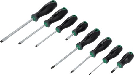 Wkrętaki płaskie (SL): 5.5x100mm, 6.5x125mm, 8mm (do standardowych prac) oraz krótki wkrętak 6,5x38mm (idealny do ciasnych przestrzeni).