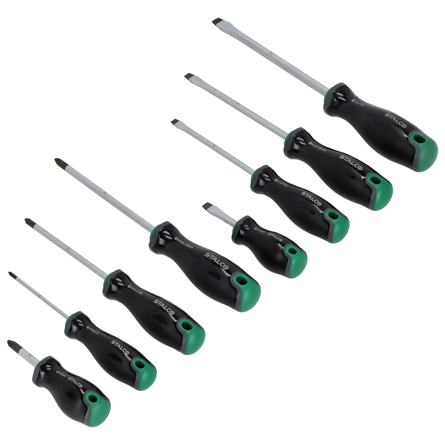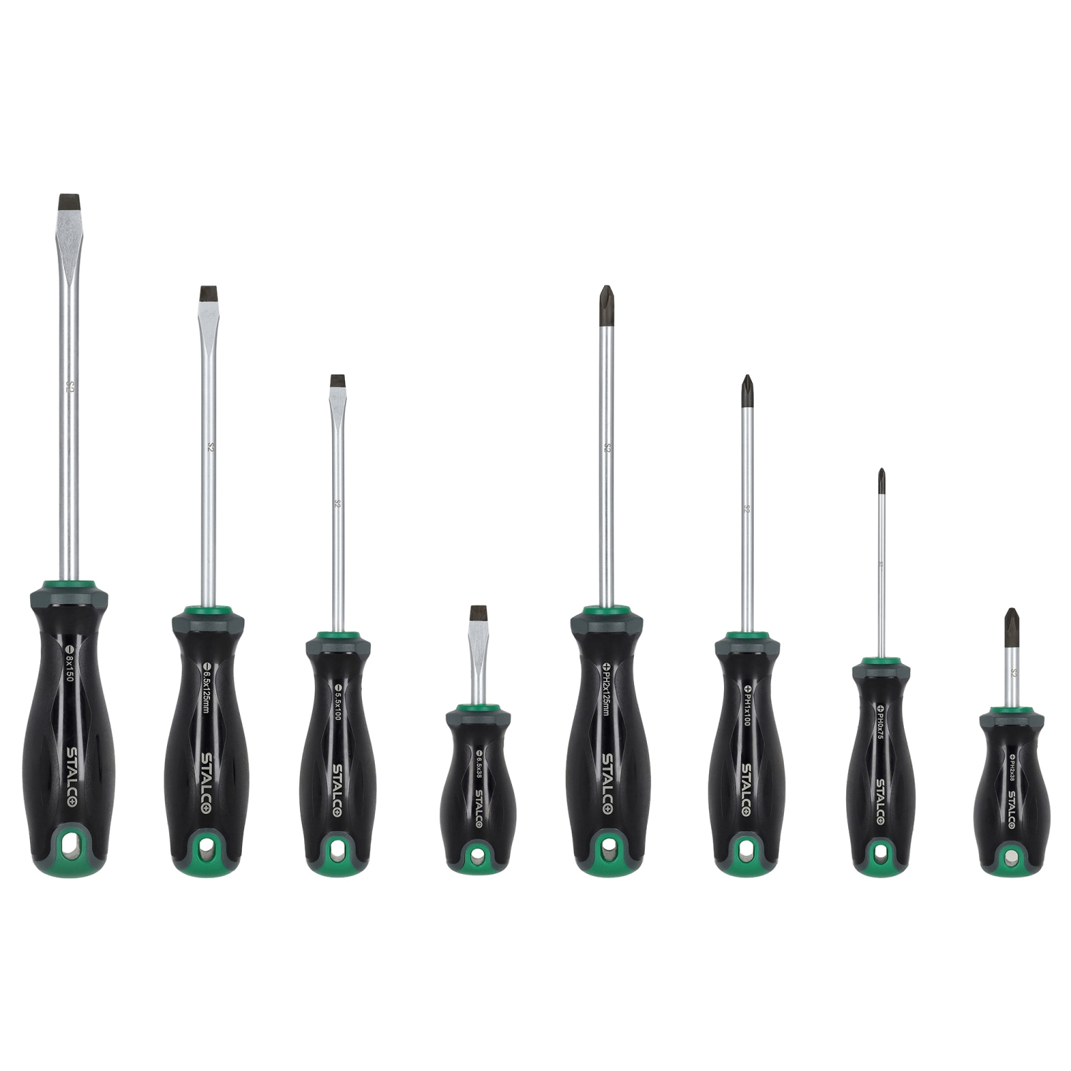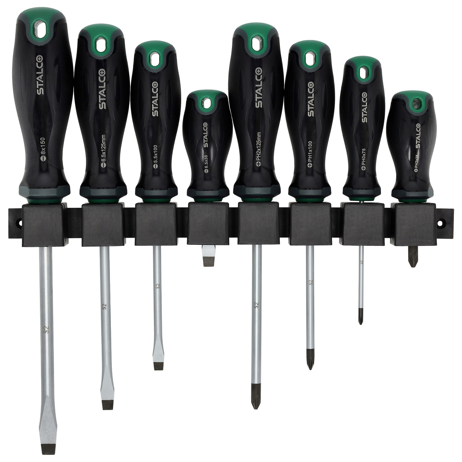 Wkrętaki 8elem. S2 SL: 5.5, 2x 6.5, 8mm, PH0x75, PH1x100, PH2x38, PH2x125mm STALCO S010812100